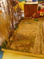 Pour parfaire le décor du terrain vague et de ses environs, par facilité (afin d'éviter la mise en peinture), j’ai utilisé des éléments naturels : terre, bois, mousse, pierres. Un mélange de terre, d’eau et de colle à bois a été étalé à des endroits judicieux. Un dolly est utilisé pour représenter le chemin avec les traces de roues. Laisser sécher, l’illusion est parfaite.