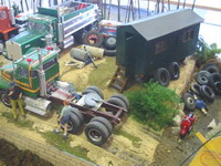 Il suffit alors de mettre les véhicules en place et en situation, les personnages, les accessoires (vieux pneus, jantes, outils, bonbonnes d’air, moteur, pièces diverses, lames de ressort,...).